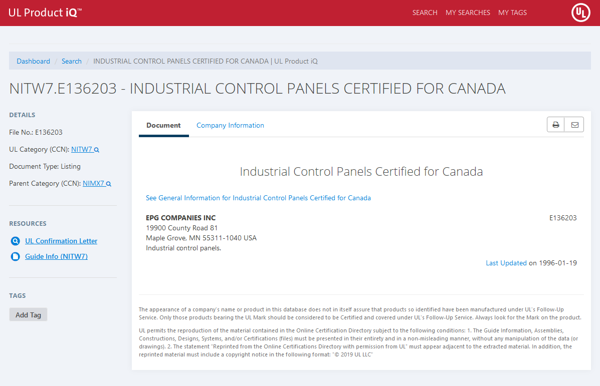 | EPG COMPANIES INC | Industrial Control Panels | NITW.E136203 |
