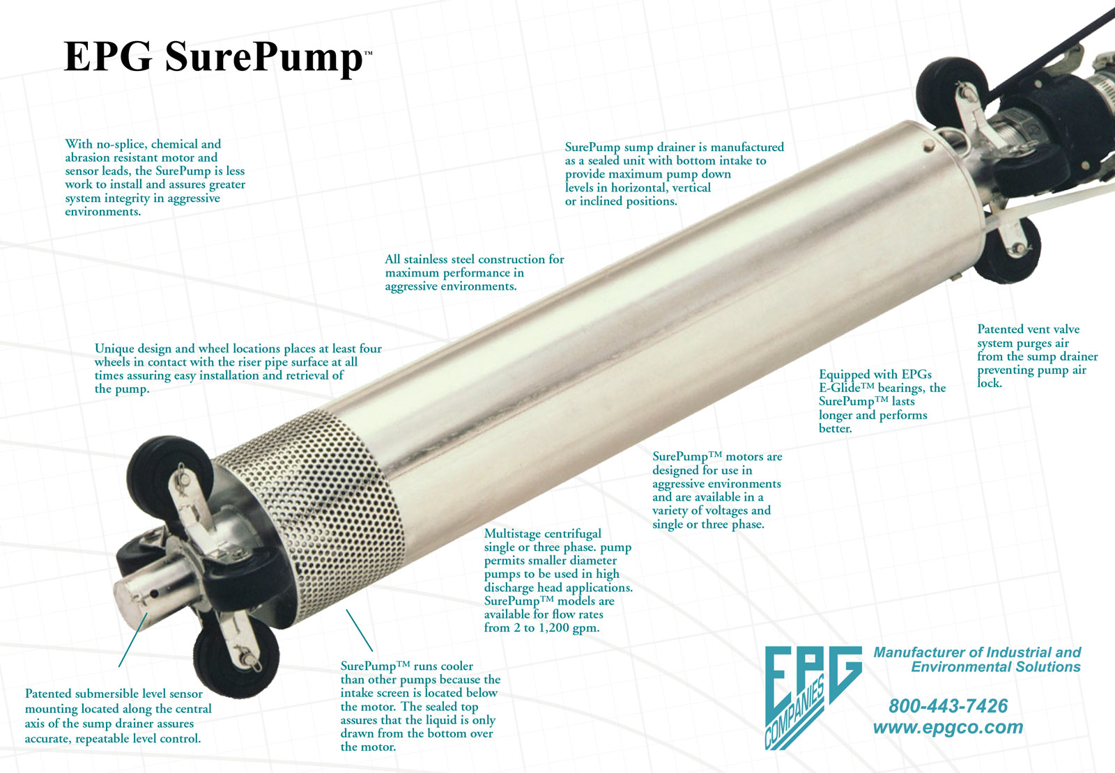 Innovative patented design, long-lasting performance and accurate “central-axis” level sensing are reasons EPG’s SurePump is the leachate pump of choice among 1,000’s of landfill professionals.